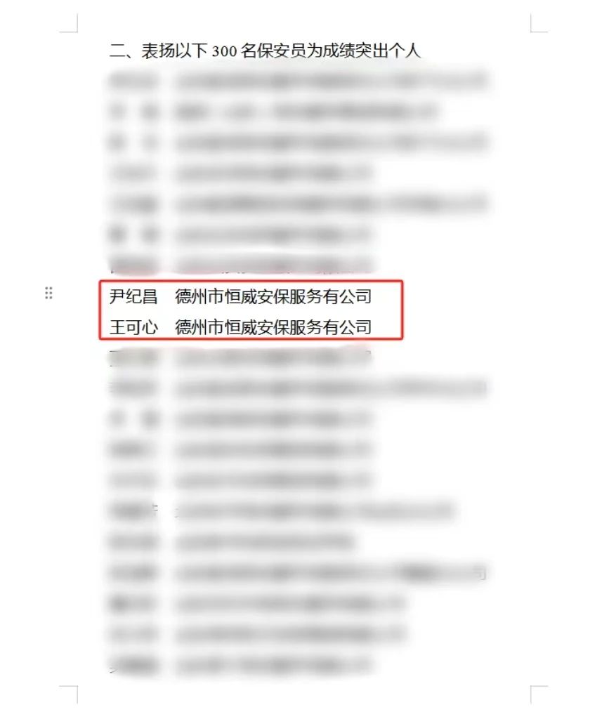 近日,山東省公安廳印發《關于對全省保安行業成績突出集體和個人予以表揚的通報》,德州市恒威安保服務有限公司榮獲2023年度“全省保安行業成績突出集體”榮譽稱號;公司員工尹紀昌、王可心榮獲“成績突出個人”。